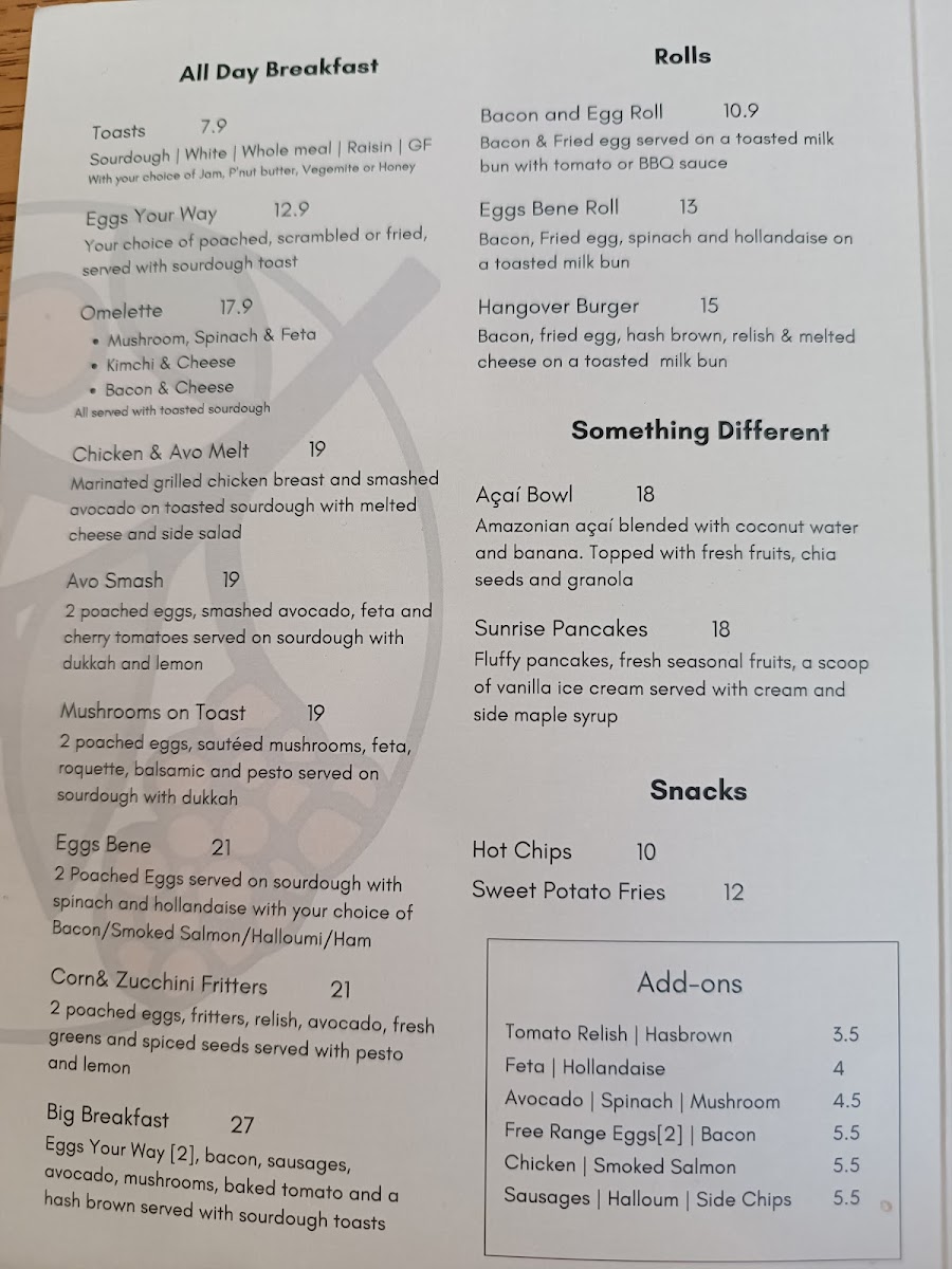 If you’re in the mood for something sweet, the SUNRISE PANCAKES serve up fluffy goodness with fresh seasonal fruits and a delightful scoop of vanilla ice cream drizzled with maple syrup. Priced at A$20.00, these pancakes are a brunch dream come true, making every bite a heavenly experience.